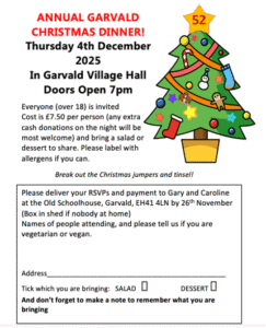 The clocks are about to go back, winter is coming and yet – Hurray! – the annual Garvald Christmas Dinner to look forward to. As usual it will take place on the first Thursday in December (the 4th) at 7pm. Look out for the invitations coming through your letter-boxes very soon.